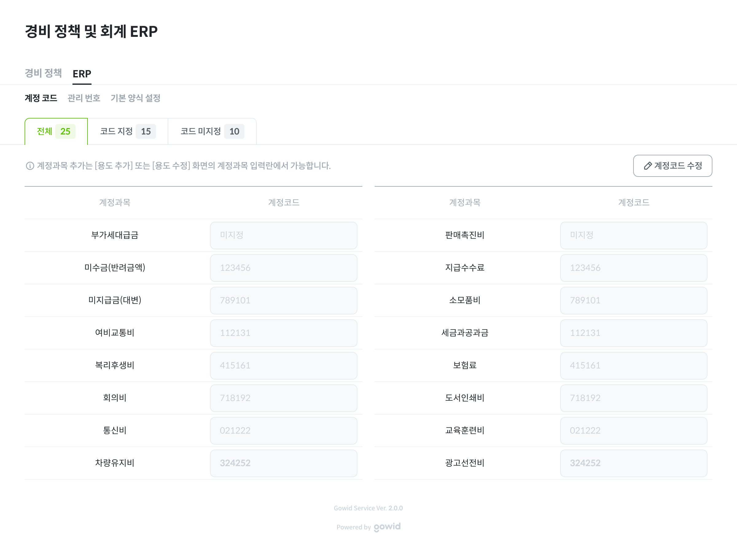 계정코드 수정버튼을 클릭하시면 각 계정 과목에 계정코드를 설정할 수 있습니다.
