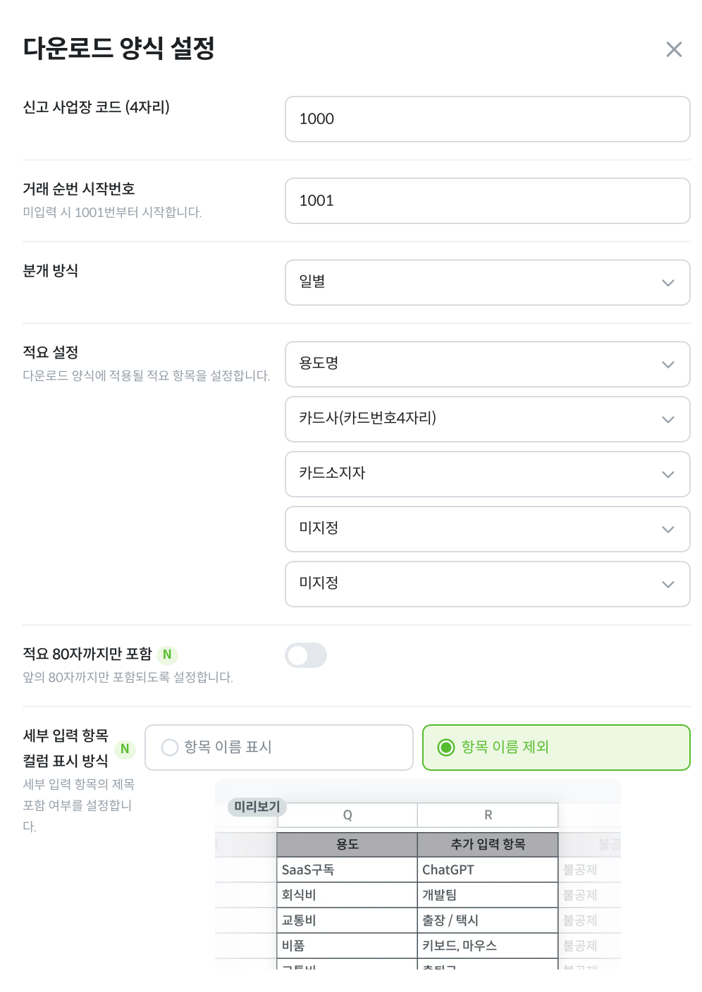 적요 설정: 다운로드 양식에 적용될 적요 항목을 설정해주시기 바랍니다.