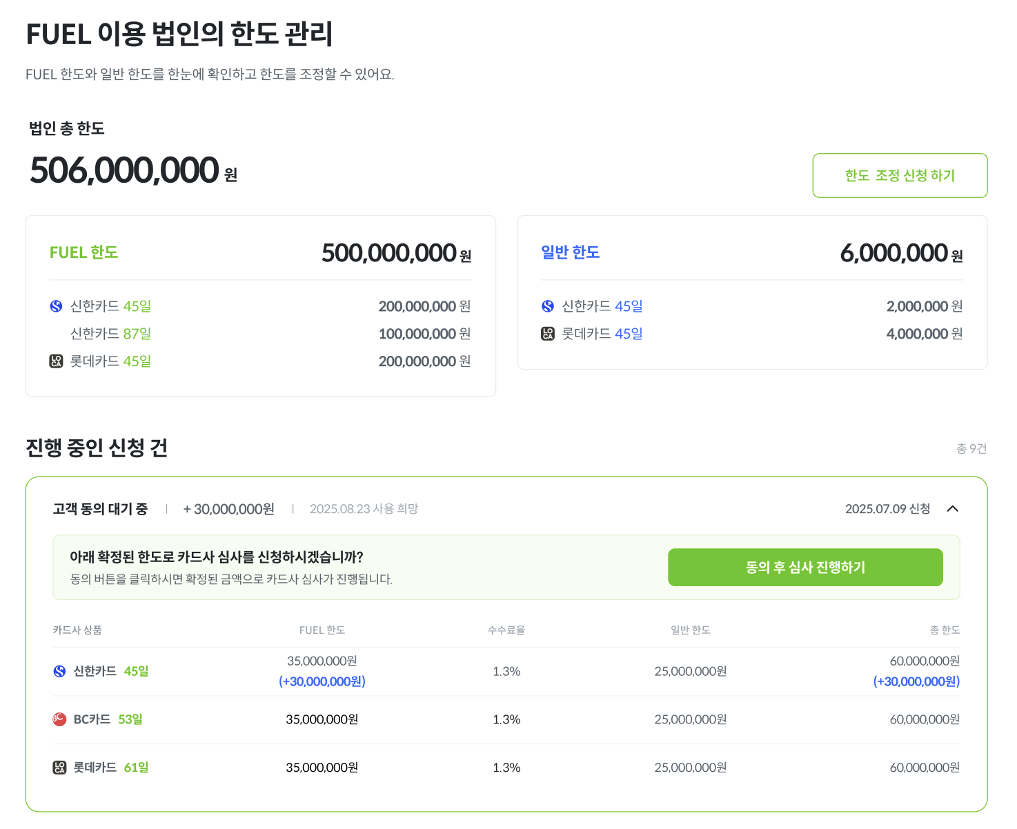 [한도 확인 및 동의하기]링크에서 부여 예정인 한도를 확인 후, 동의를 진행합니다.[FUEL 이용 법인의 한도 관리]탭에서 카드사별·상품별로 부여된 FUEL 한도를 확인할 수 있습니다.한도 내용을 확인한 후