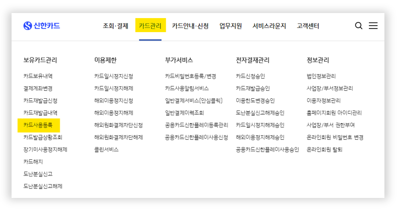 step 1 신한카드 법인 홈페이지 접속 후 [메뉴 > 카드관리 > 카드사용등록] 링크 클릭