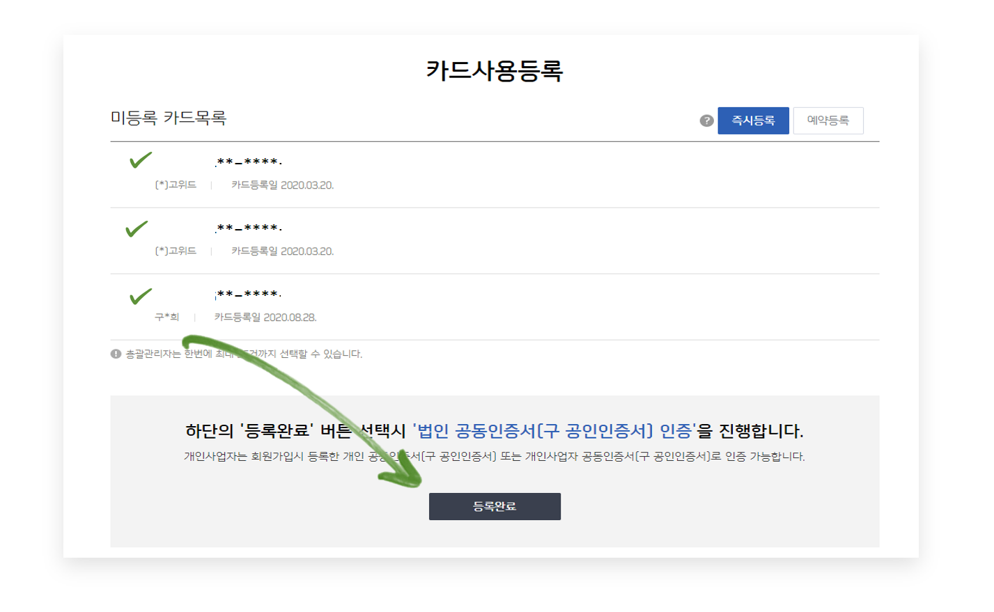 등록 시 공용(법인 명의) 카드는 법인 명의의 공동 인증서, 지정(기명) 카드의 경우 해당 임직원의 공인 인증서가 필요합니다.