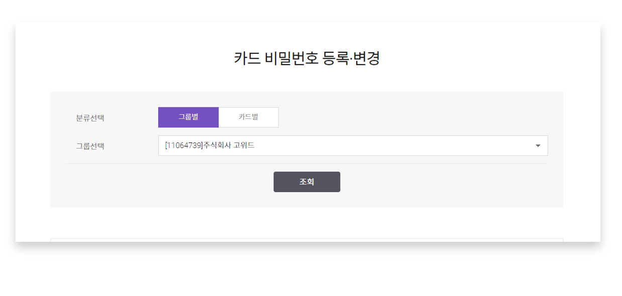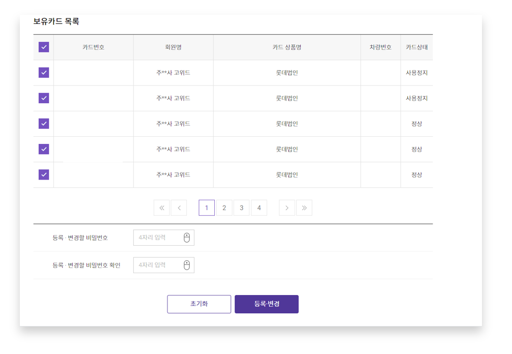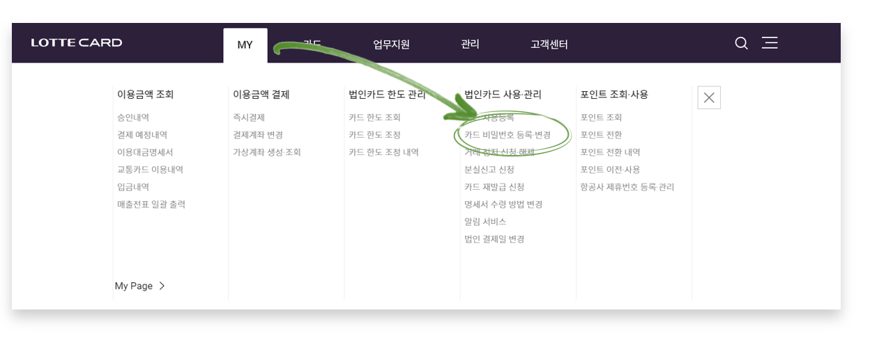 법인관리자로그인메뉴 > MY > 법인카드 사용 관리 > 카드 비밀번호 등록/변경 클릭