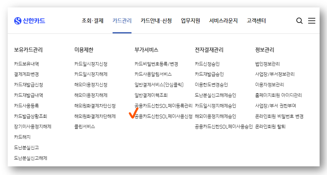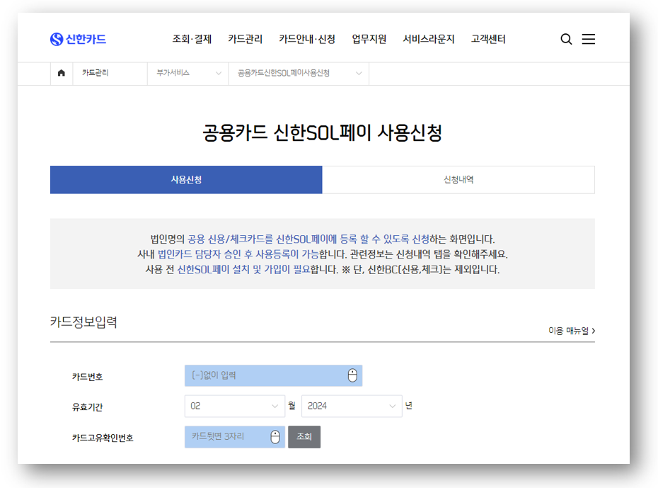 상단 [카드관리] → [공용카드신한SOL페이사용신청]
