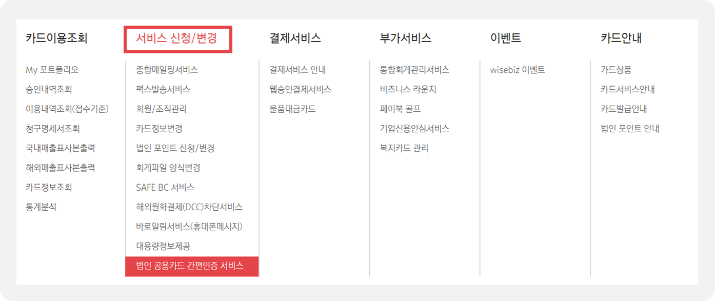 [서비스 신청/변경] - [법인 공용카드 간편인증 서비스] 를 선택합니다.