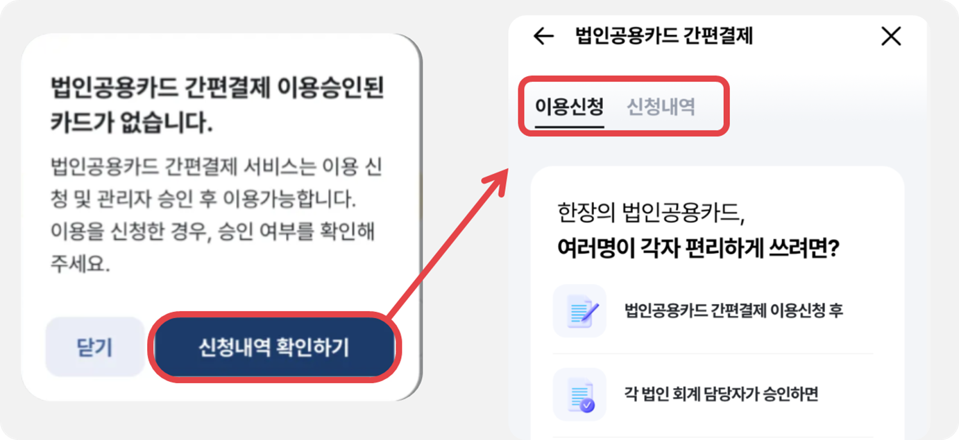위 단계까지 완료되었다면, 페이북 결제 내 [법인공용카드 간편결제] - [신청내역] 에서 추가한 카드가