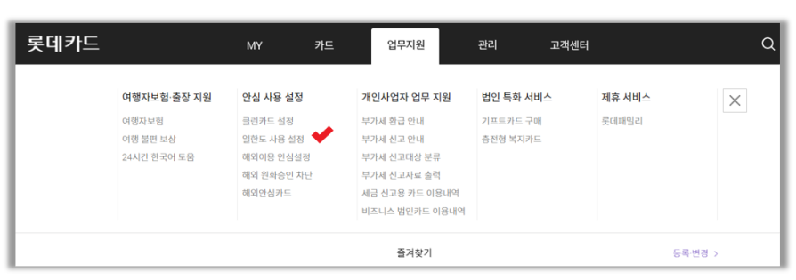 카드 일 사용 금액과 사용 횟수 제한 설정은 일한도 사용 설정 메뉴에서 설정 가능합니다.