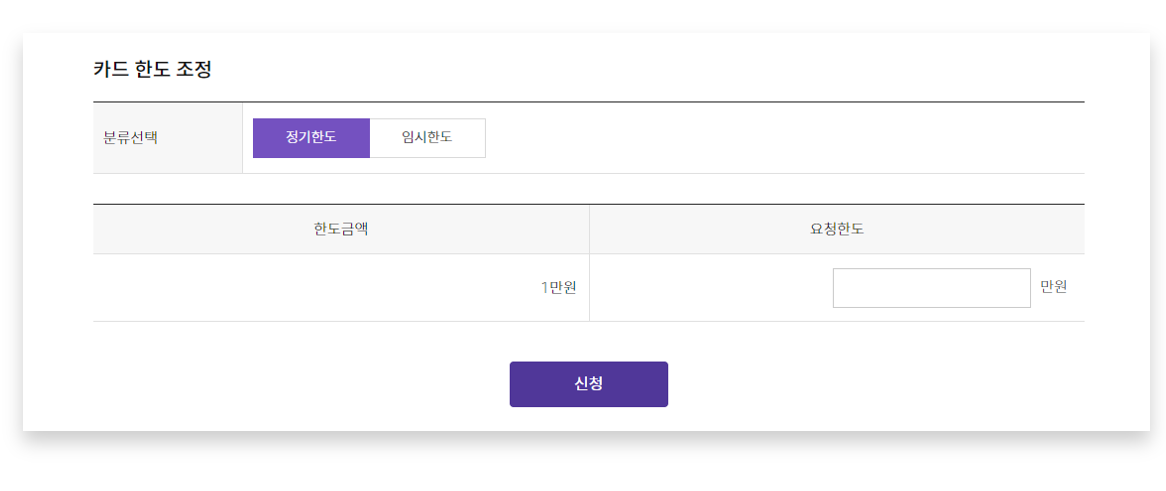 한도 변경을 원하는 카드의 [카드 한도]란에 변경할 한도 입력