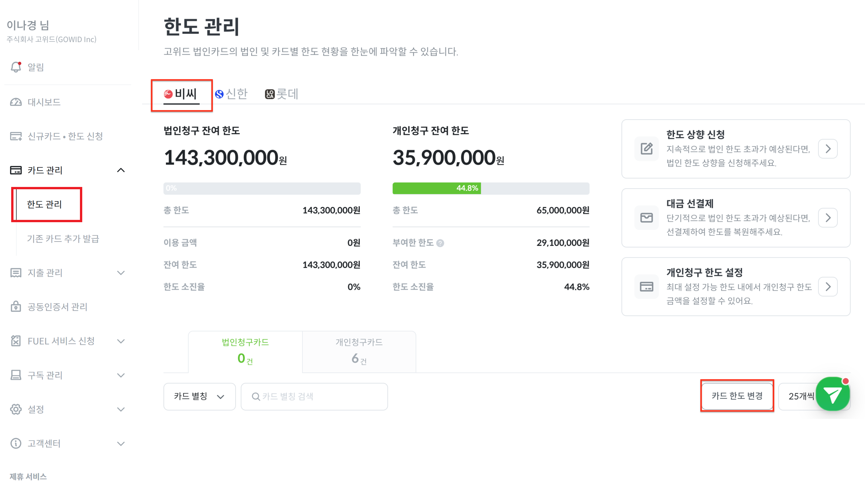 비씨카드의 경우 고위드 지출관리 서비스를 통해 변경 가능합니다.