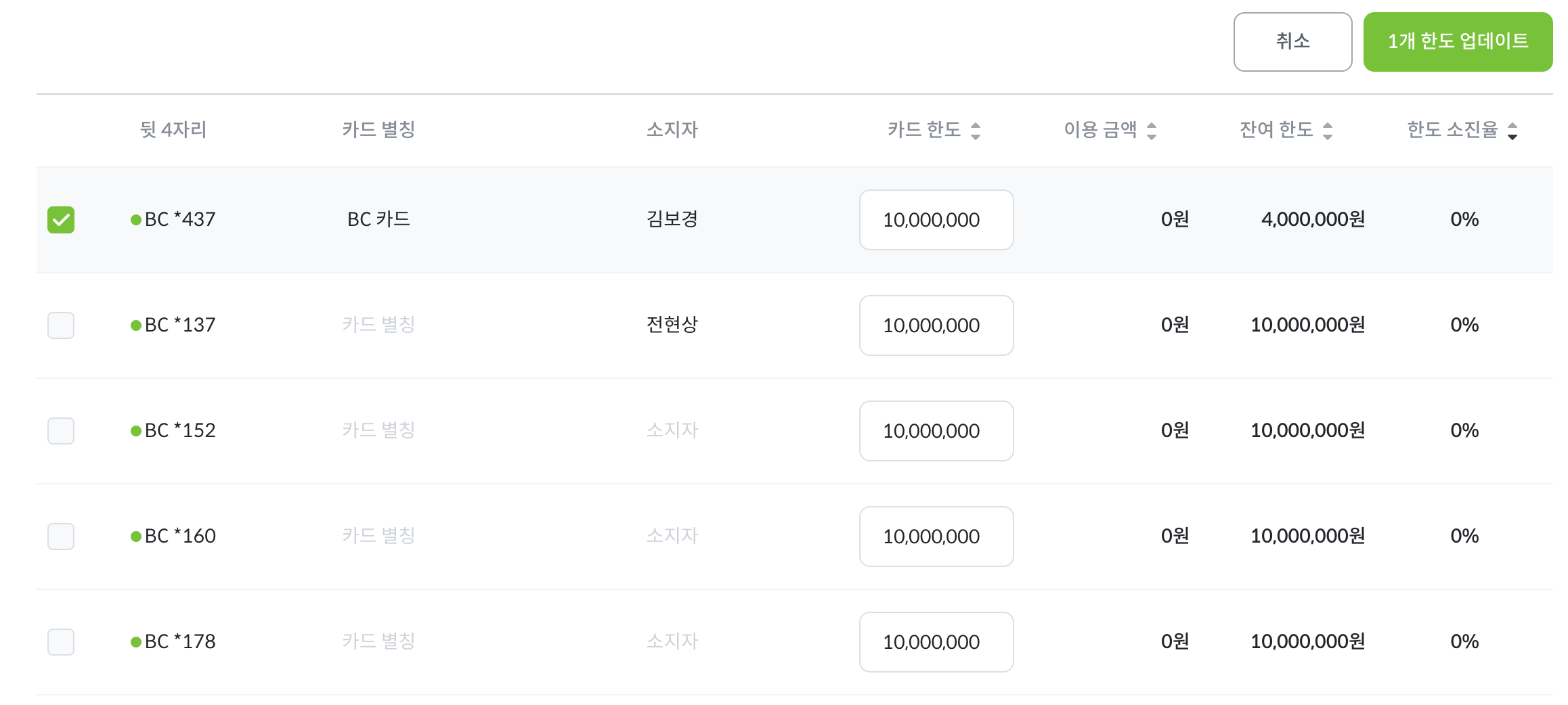 카드 번호 별로 한도를 설정해주셔야 됩니다.