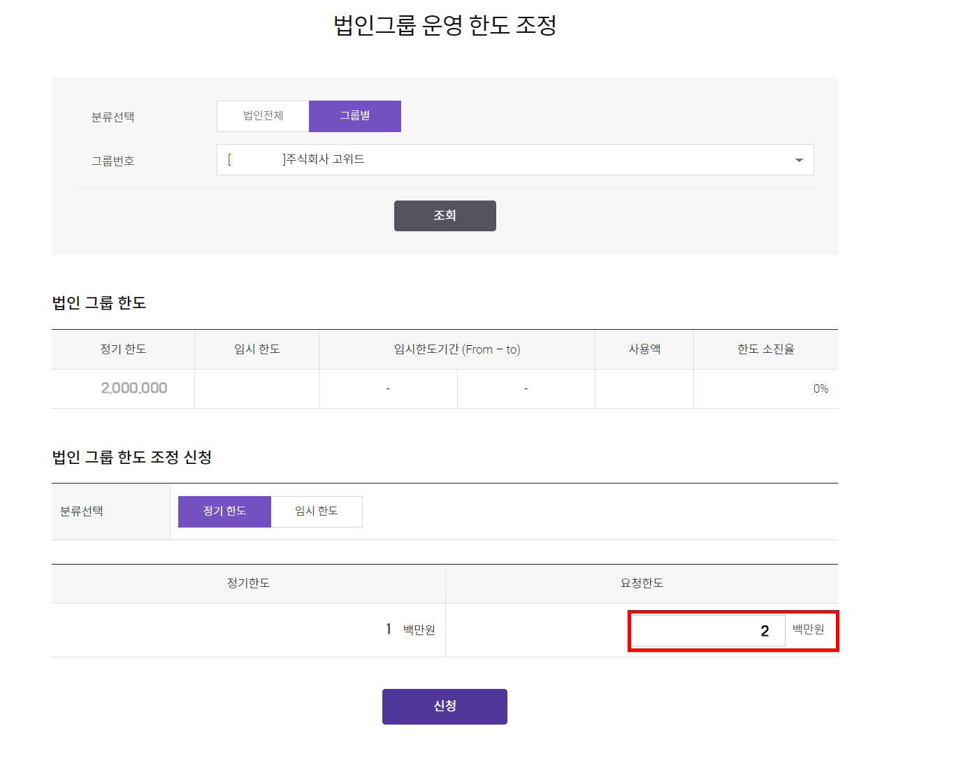 법인사 총 한도에 맞게 그룹 한도 입력 후 신청 클릭