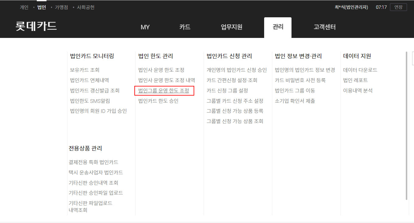 상단 [관리] - [법인그룹 운영 한도 조정] 클릭