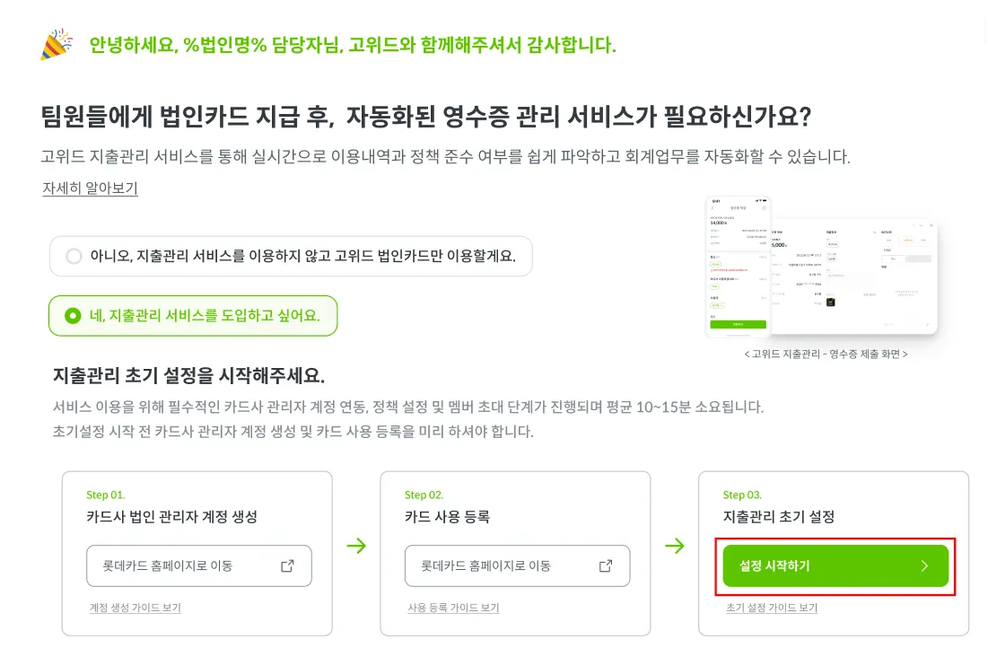 " 네, 지출관리 서비스를 도입하고 싶어요. " 클릭 후, [ 설정 시작하기 ] 버튼을 클릭 하시면 초기 설정이 시작됩니다.