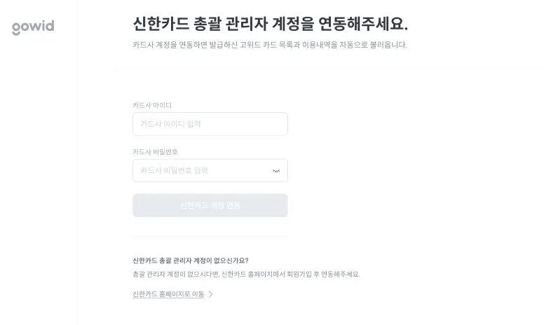 아직 법인 관리자 계정이 없으시다면 신한카드 홈페이지로 이동 링크를 통해 가입을 진행해주세요.