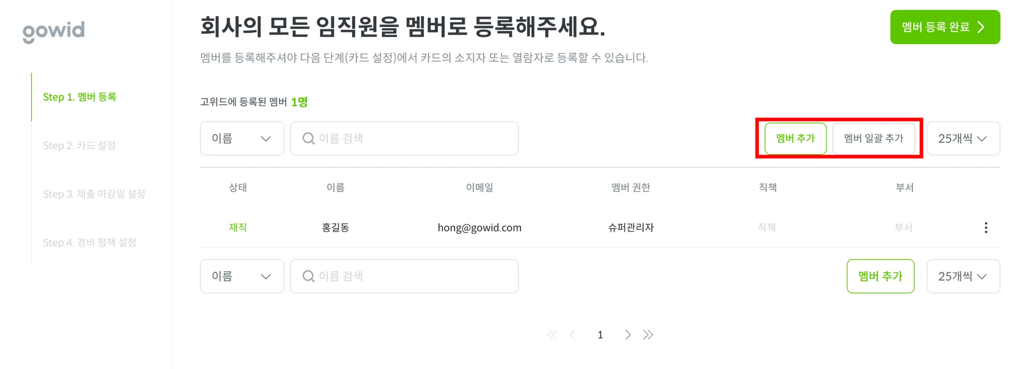 [ 멤버 추가 ] 버튼을 통해 회사의 모든 임직원을 등록해주세요.