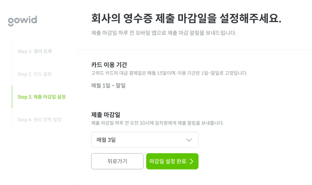 임직원들이 언제까지 카드 이용 내역을 제출하도록 설정할지, 영수증 제출 마감 기한을 정하는 단계입니다.