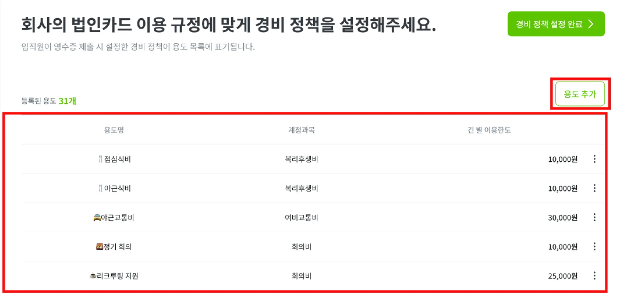 회사의 경비 정책에 맞게 카드가 결제되고 영수증이 제출될 수 있도록, 지출 용도와 용도별 이용 한도를 설정하는 단계입니다. 용도별 계정과목 설정을 통해 회계 관리를 더 편하게 할 수 있습니다.