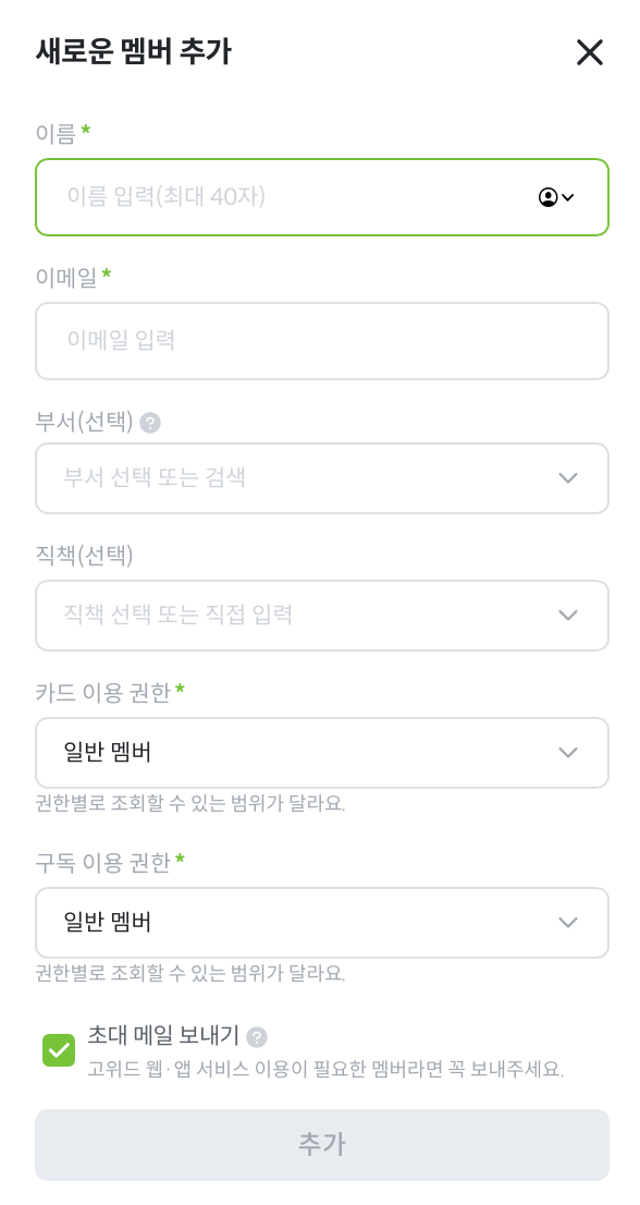 카드를 지급할 멤버가 아니더라도, 회식비 등을 결제하고 나서 법인카드 결제자가 공동사용자로 임직원을 추가할 수 있도록 모든 임직원을 등록하는게 좋습니다.