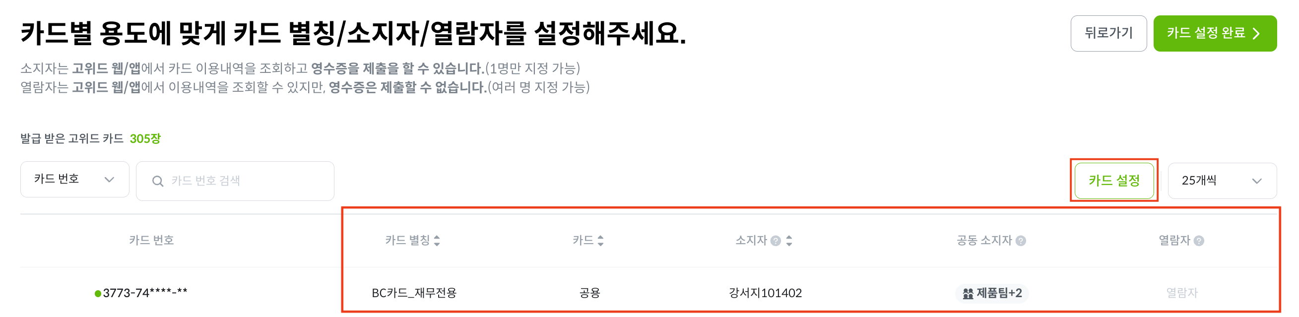 [카드 설정] 버튼을 누르시면 카드별로 카드 별칭, 소지자, 열람자를 설정할 수 있습니다.