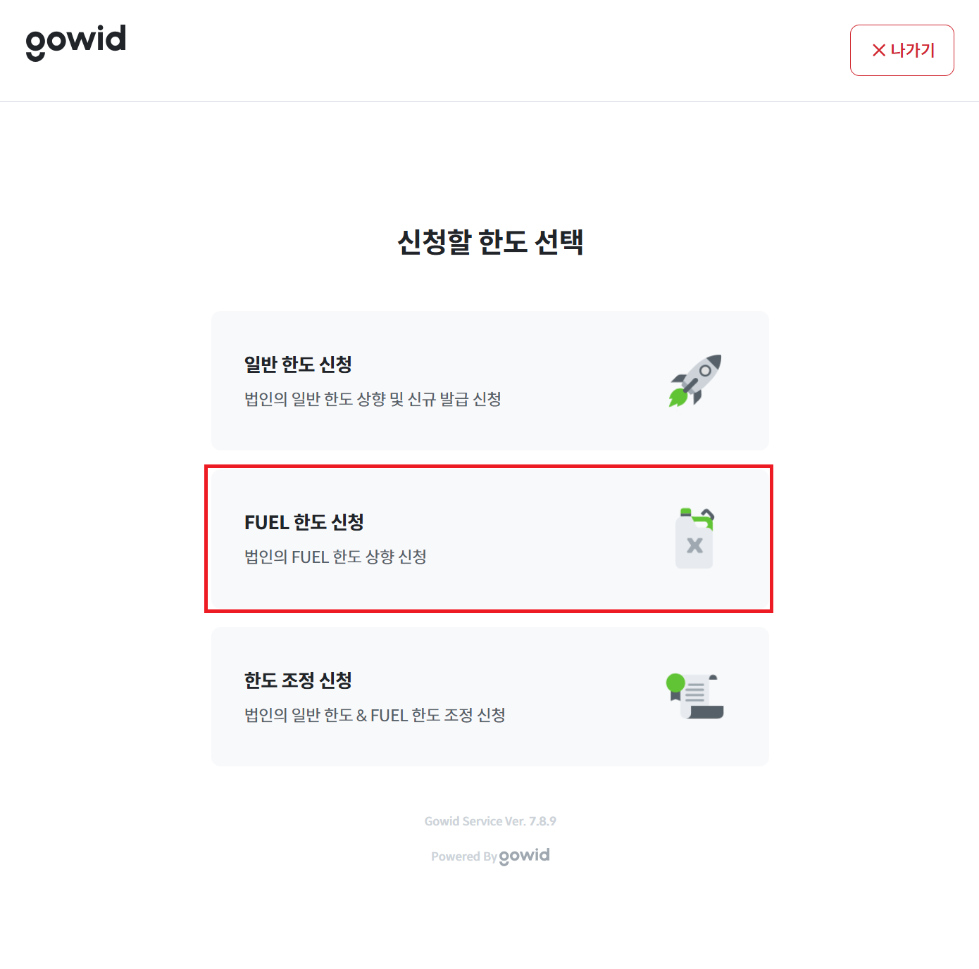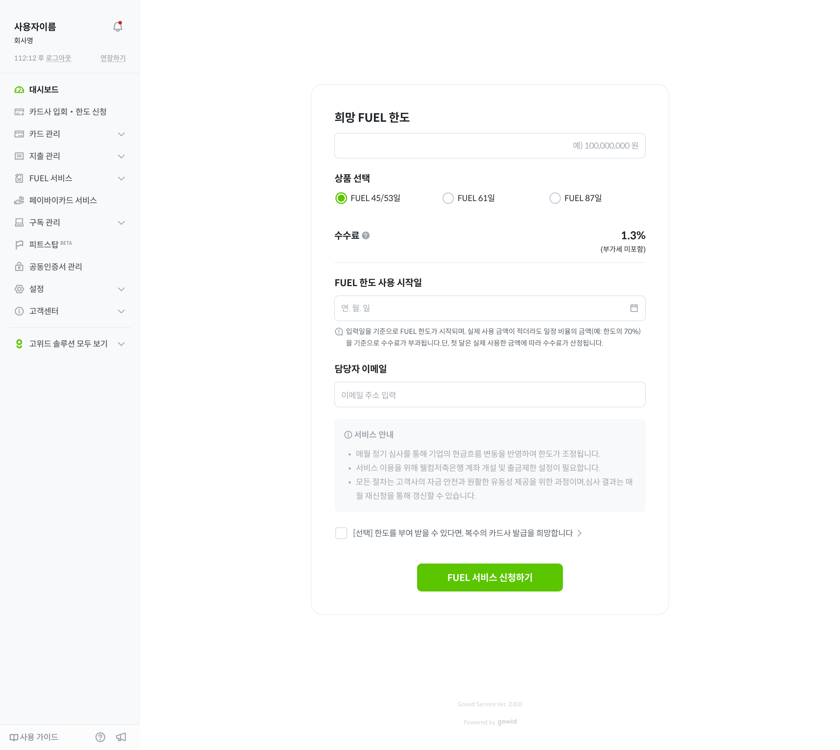 FUEL 한도를 보유하고 계심에도 해당 페이지가 노출되지 않는 경우, 고위드 담당자에게 문의해 주세요.