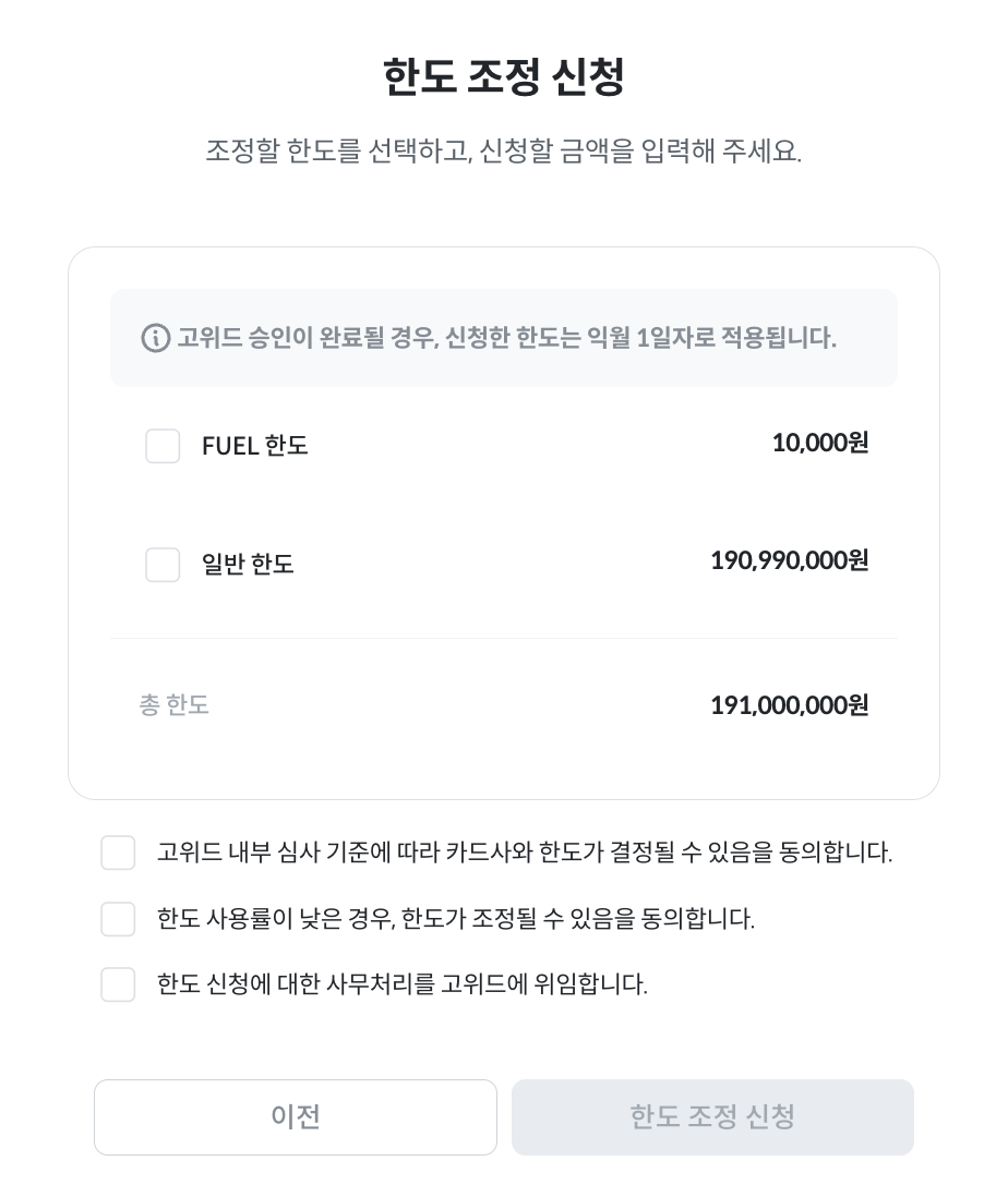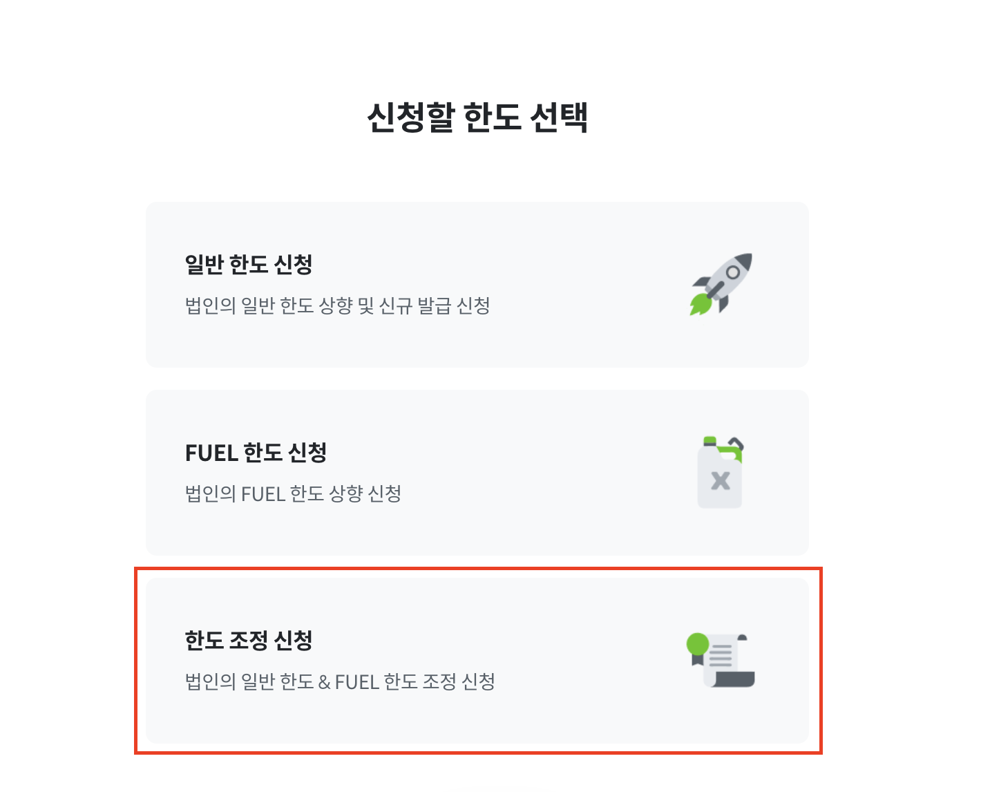[FUEL 법인의 한도 관리]메뉴 내[일반한도 신청]/[FUEL 한도 신청]기능을 이용해 주세요.신청하신 한도에 대해 고위드 승인이 완료될 경우, 신청한 한도는 익월 1일자로 적용됩니다.