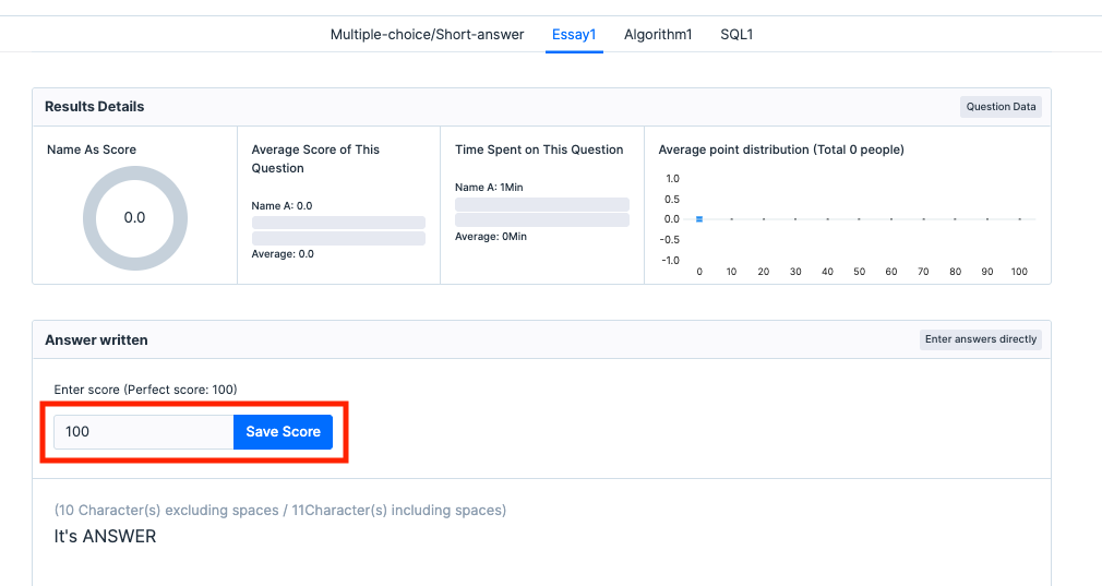 You can check each test taker's submitted answers at the bottom of their detail page and enter the score directly.