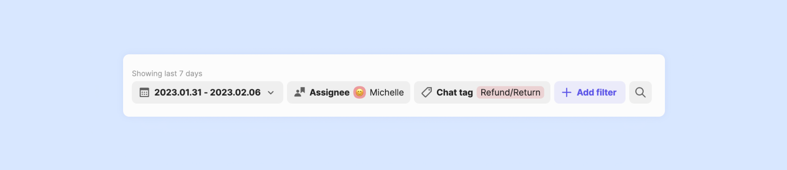 Filter through specific metrics such as period, team member, follower, and tags. In addition, if you press the magnifying glass button you can get quick access to the chats which make up that dataset. Here are the available filtering options: