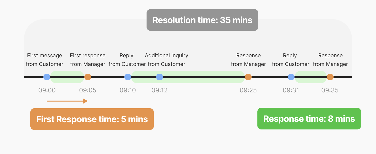 This metric is still measured if the operator sent the first message. In such a case, it measures the time between customer’s first message and the team member's follow-up message. In other words, it measures the time from a customer’s first message until the operator’s response after such a message