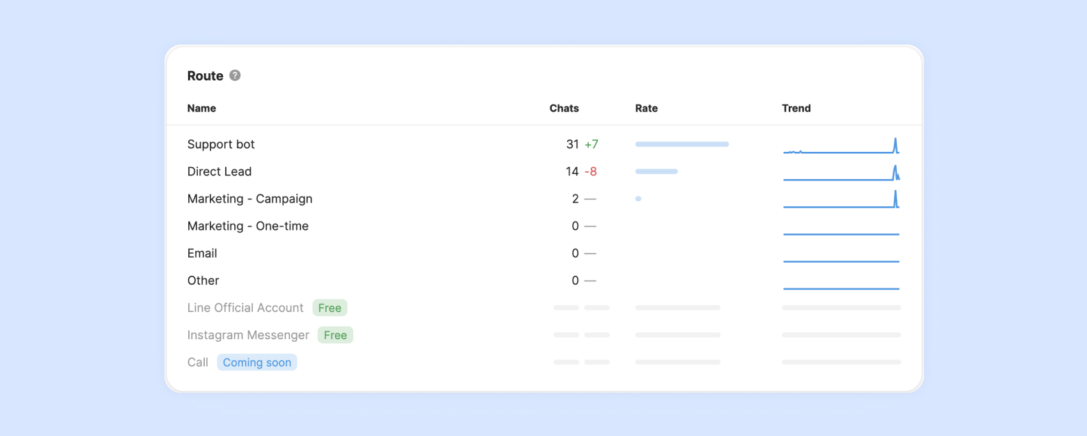 During the set period, this statistic breaks down from which method chats come. For example, it breaks it down into support bots, marketing campaigns, and external messengers.