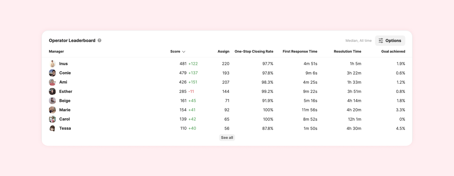 The leaderboard is a calculated score of multiple operator-specific variables. The leaderboard score is based on how efficiently each operator handled all of their chats, such as first response time, one-stop closing rate, and resolution time. As the number of assigned chats goes up, the more weight the operator’s score has on the leaderboard.