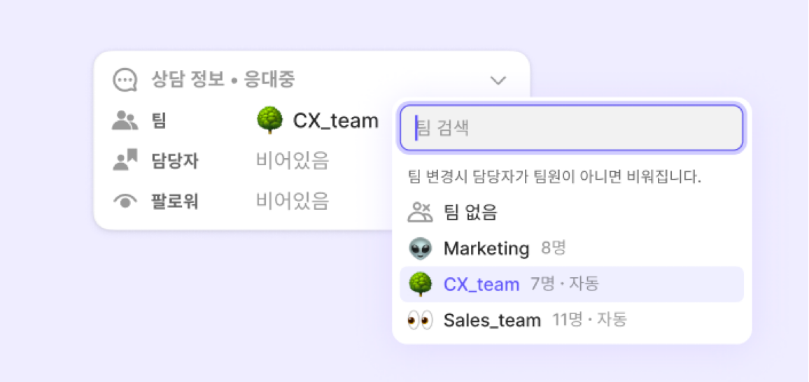 Instead of assigning conversations to individuals from the start, ChannelTalk takes a team-based approach. It first routes the inquiry to the right team, then automatically assigns it to an available team member in real time — so customers get the help they need, faster.