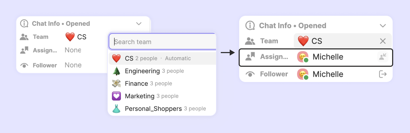 When a new chat comes in, assigning it to a team ensures that the most suitable agent is chosen based on the team’s selected auto-assignment method. You can assign teams either automatically using Workflows or manually.