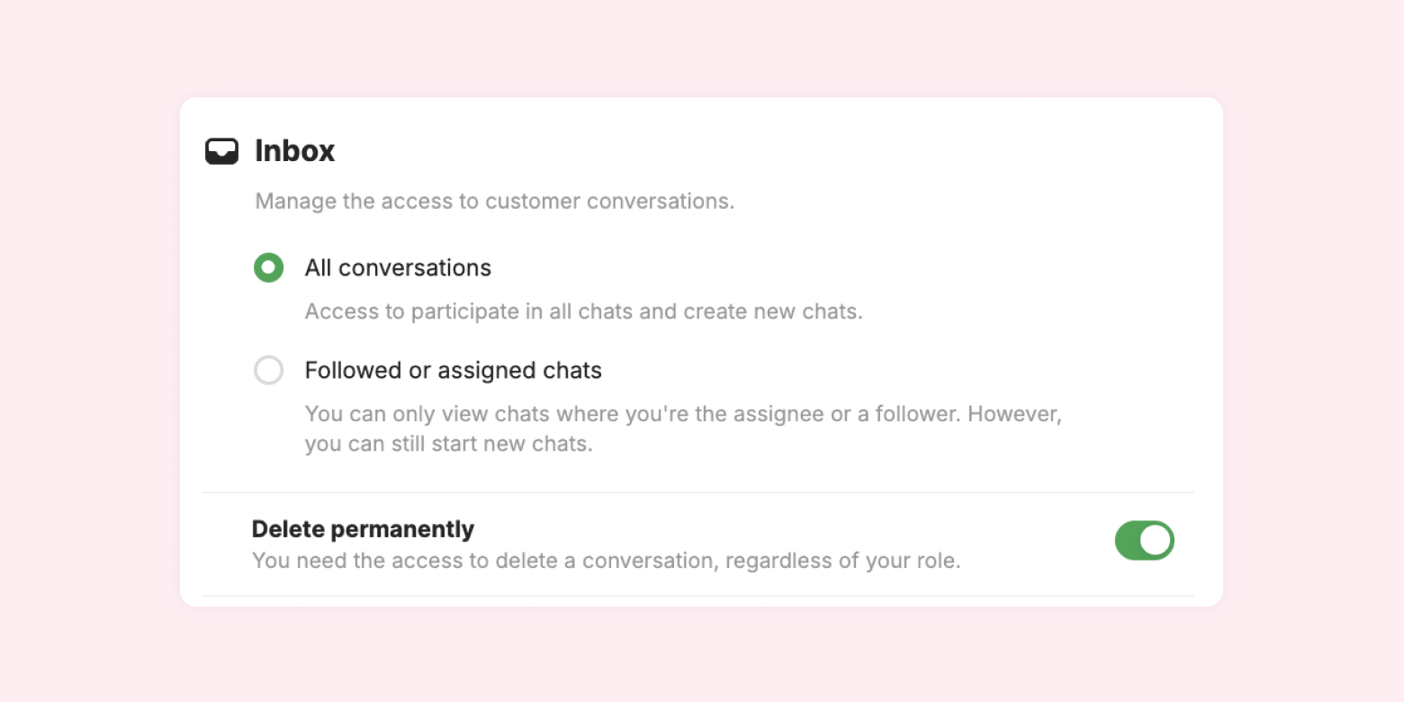 Access to view customer information for assigned or followed chats, but no access to modify or download customer information.