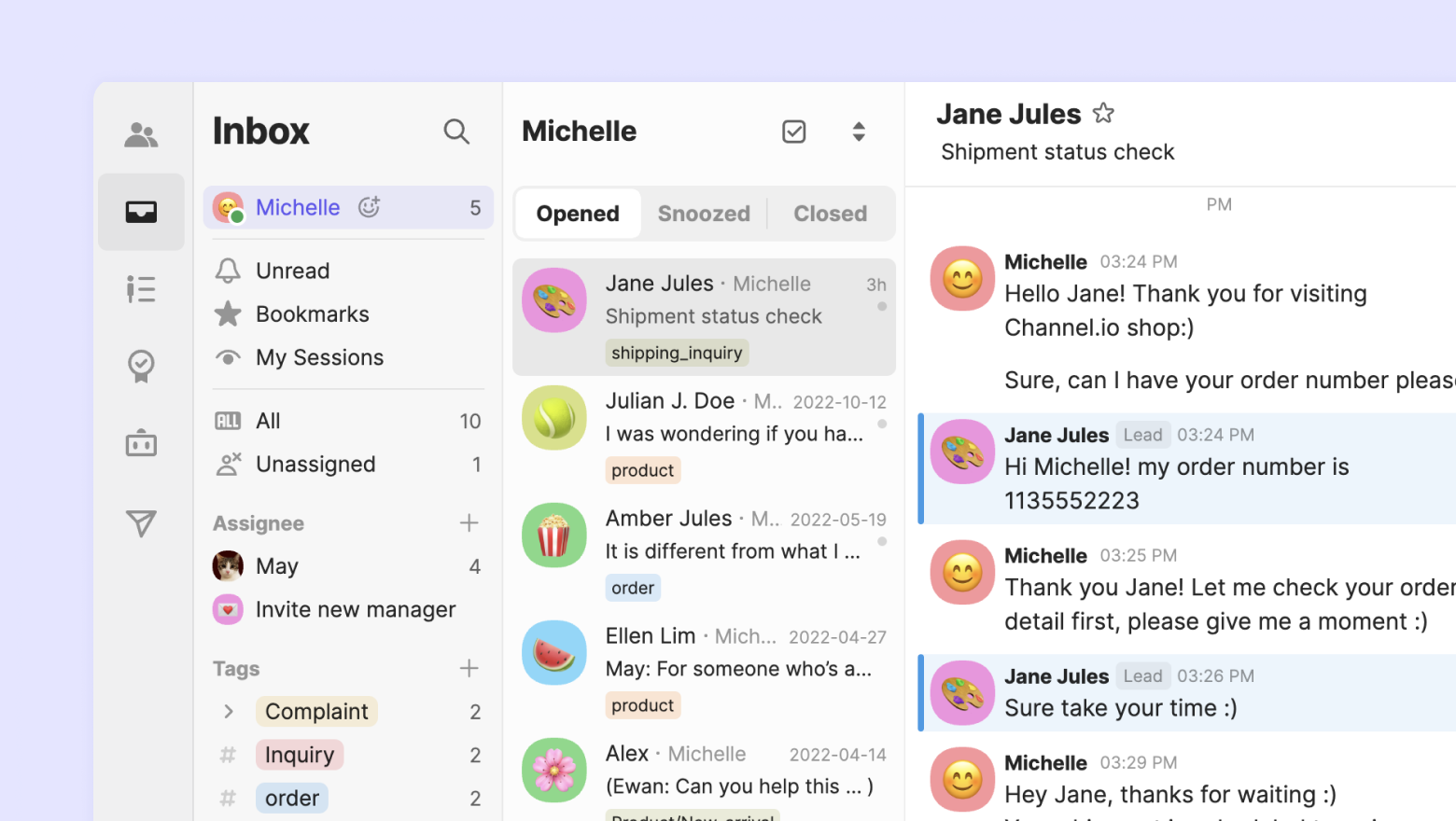Chats created after the 5th of January, 2022, where the Assignee is Michelle and the Chat status is Opened/Snoozed