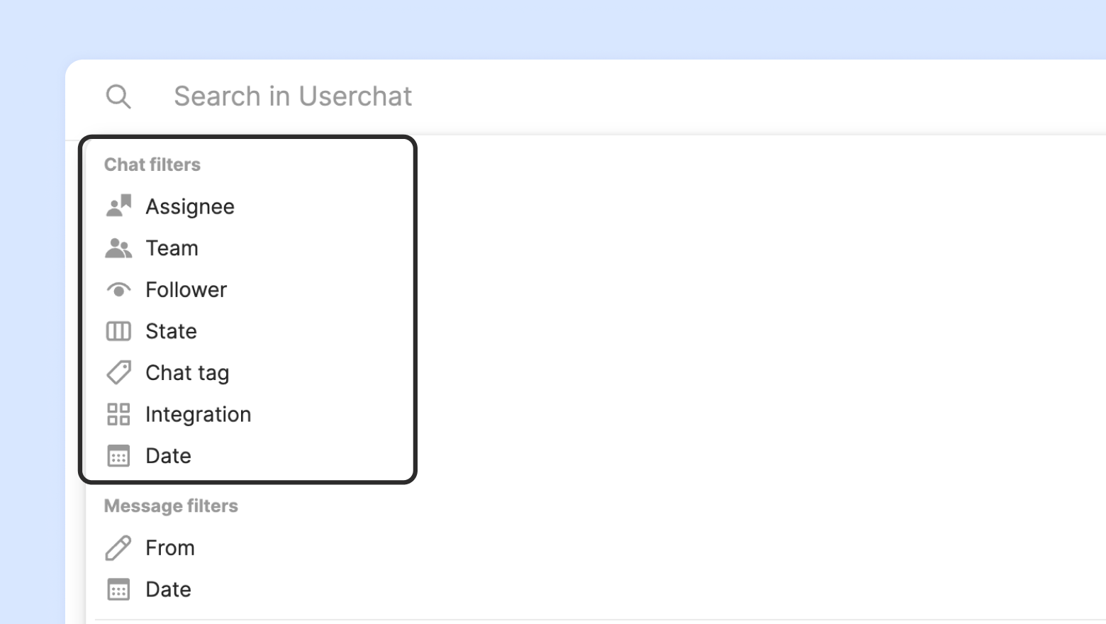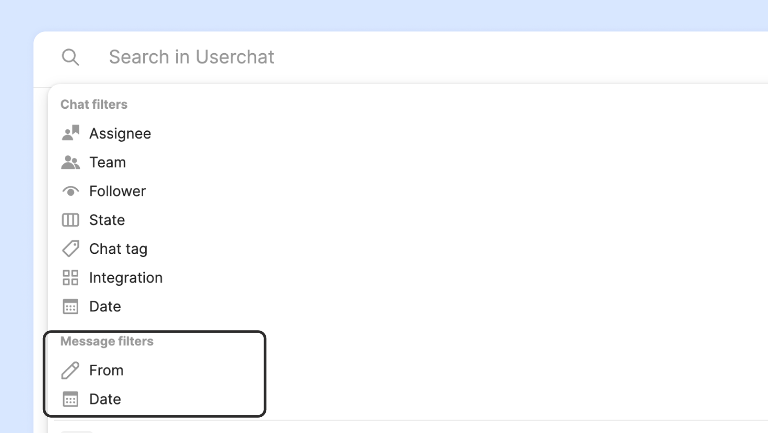 Date | before: after: | Search for user chats that have been opened before and after a specific date. (Search will include this date). |