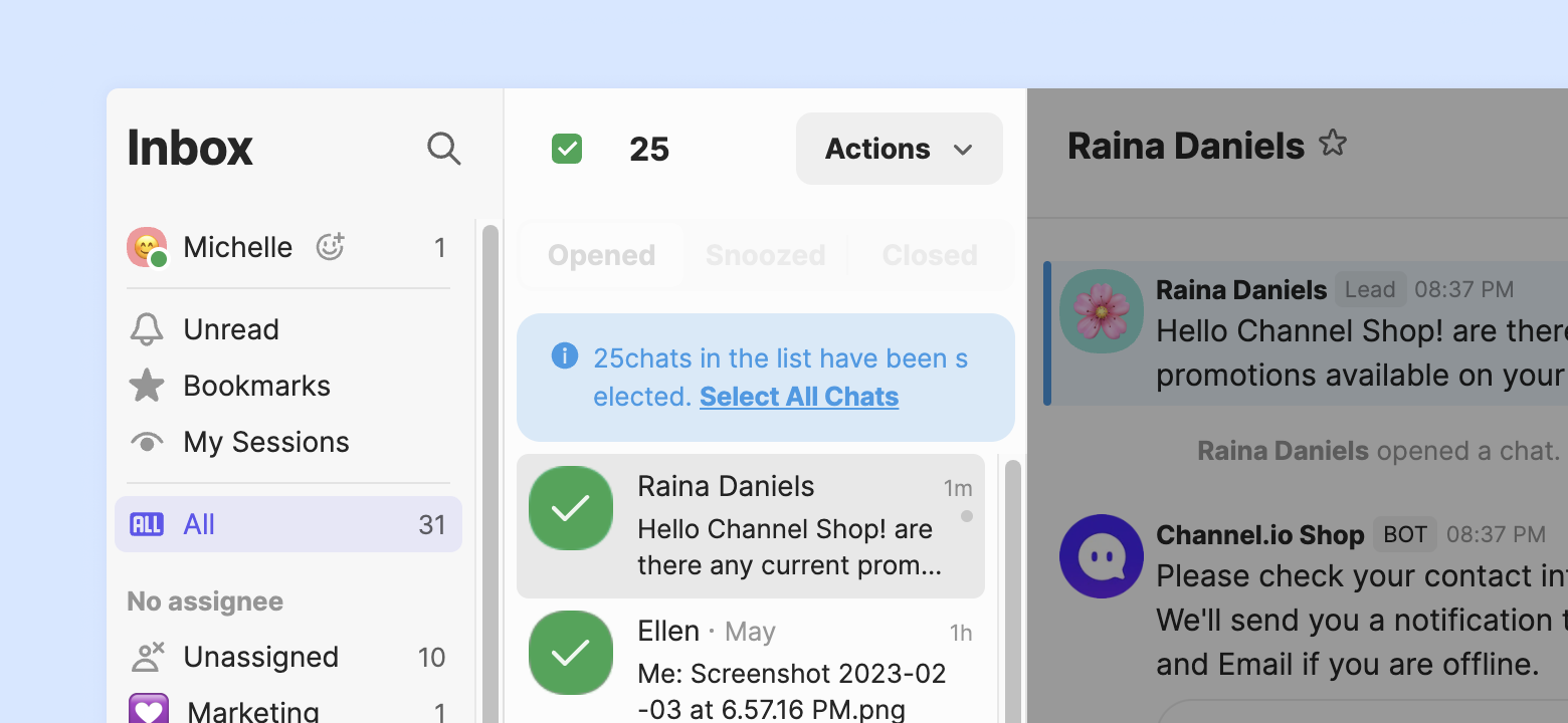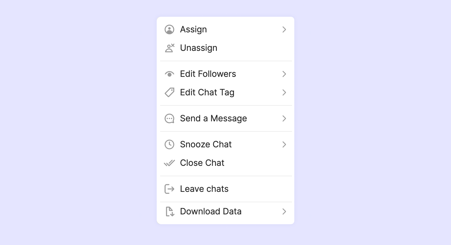 After selecting a chat, click [Actions] to display a list of bulk actions. You can change or add information to selected chats, send messages or download data in one action.