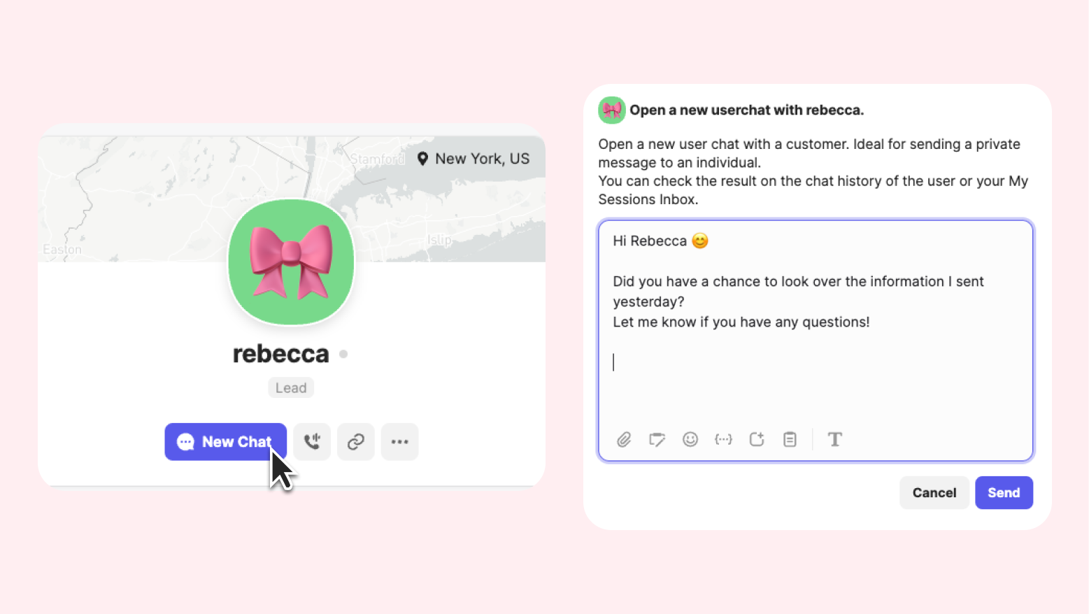 Dive into a customer's profile to see their details at a glance, including customer information, chat history, events, and more.