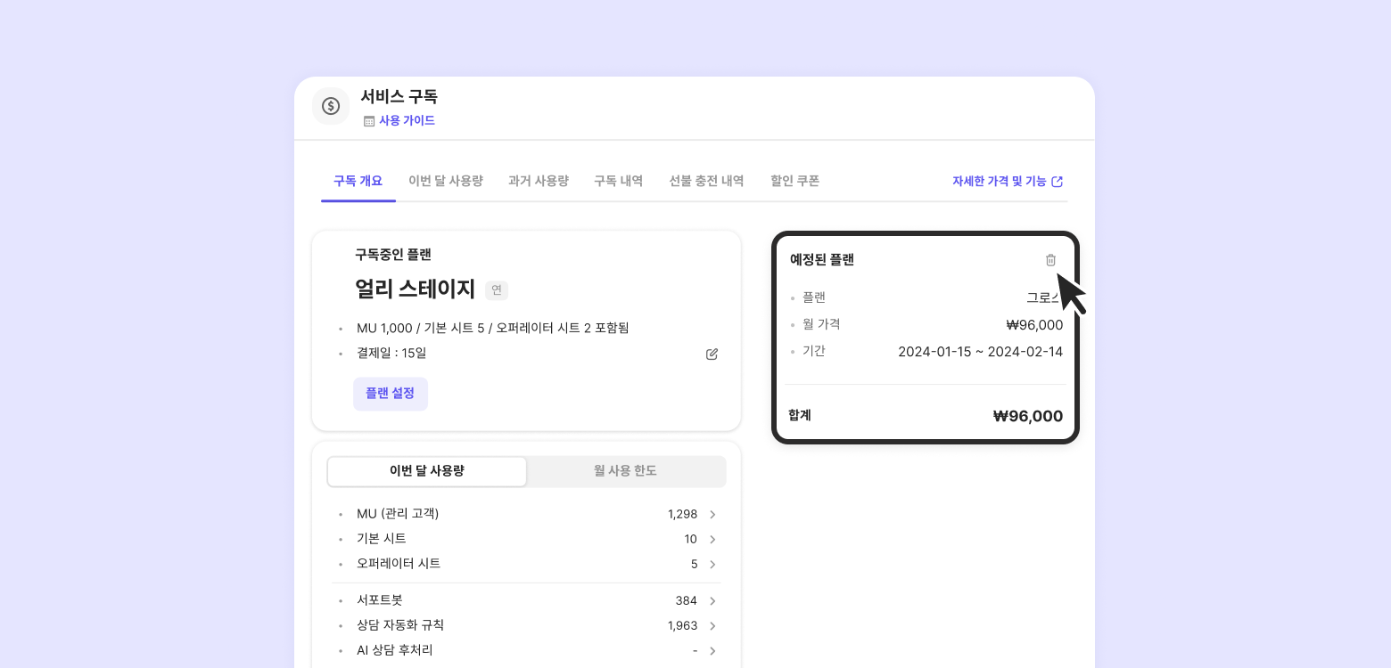 You can manage your subscription details, such as renewal options, payment dates, and usage, from [Billing] - [Subscription]. In addition, you can check your current usage to monitor your billing amount.