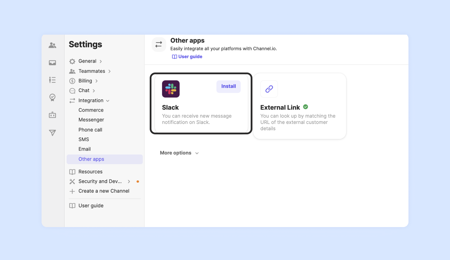 Go to [Channel Settings] - [Integration] - [Other Apps] - [Slack box] and click [Install].