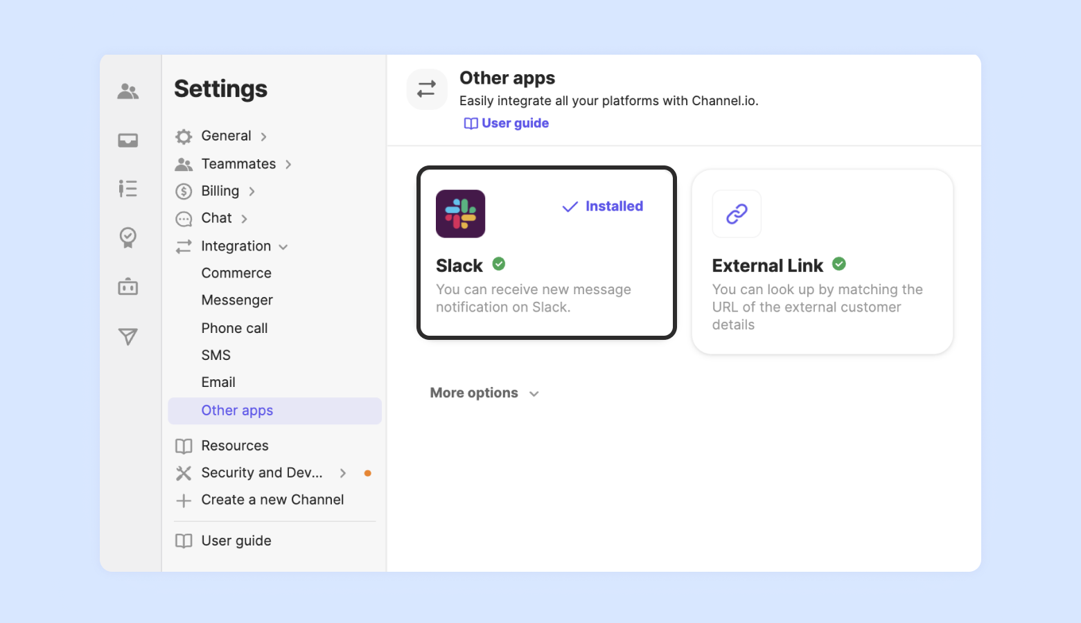 Go back to the Installation button at [Channel Settings] - [Integrate] - [Other Apps] and check that the installation is complete.