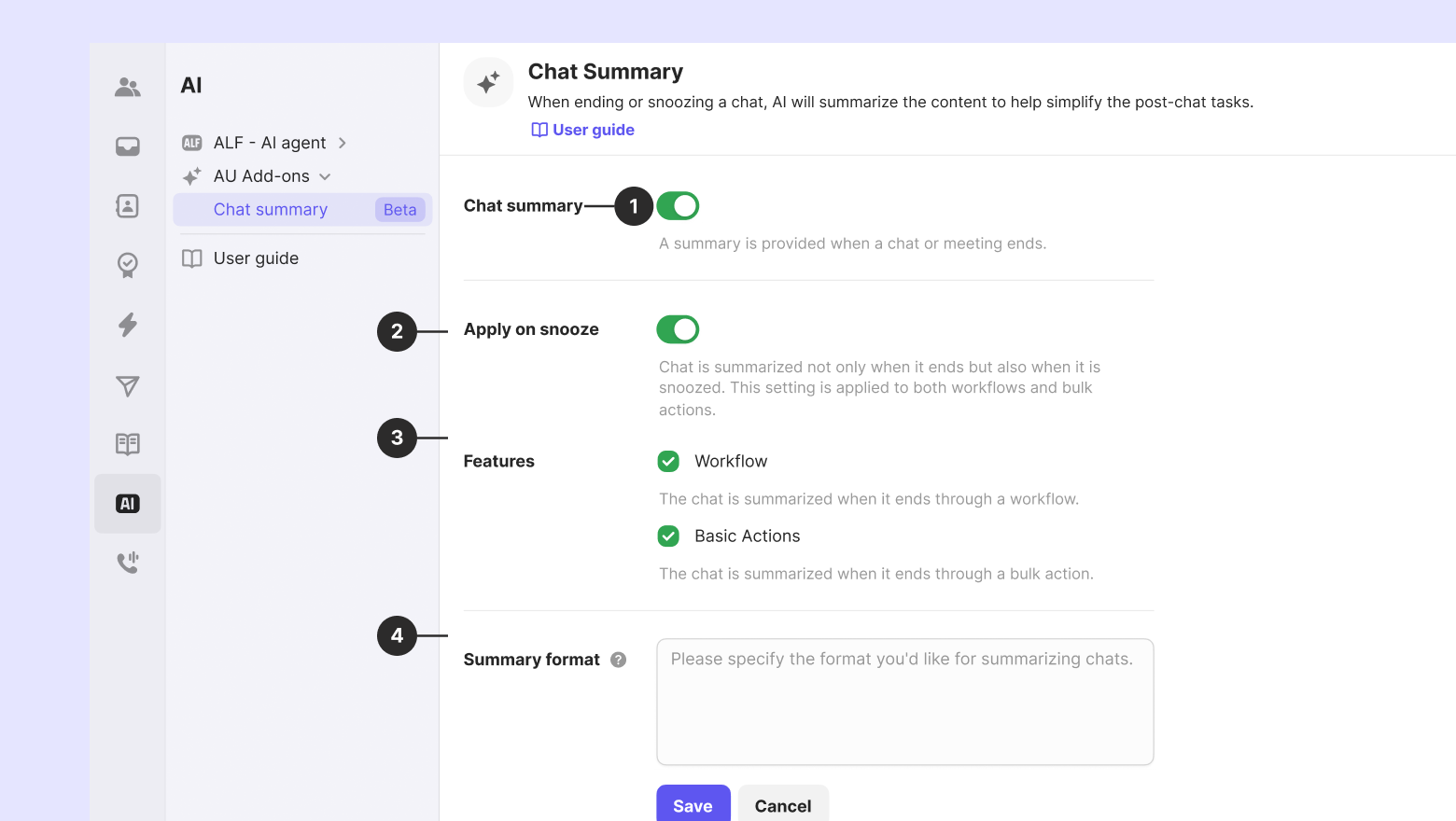 You can choose whether the summary feature operates when ending chats via workflows or bulk actions.