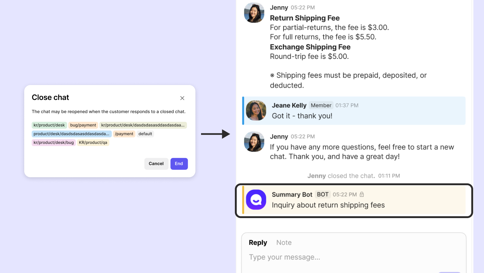 Once tags are set and the chat is ended or snoozed, the conversation summary will be saved as an internal message in the chat.