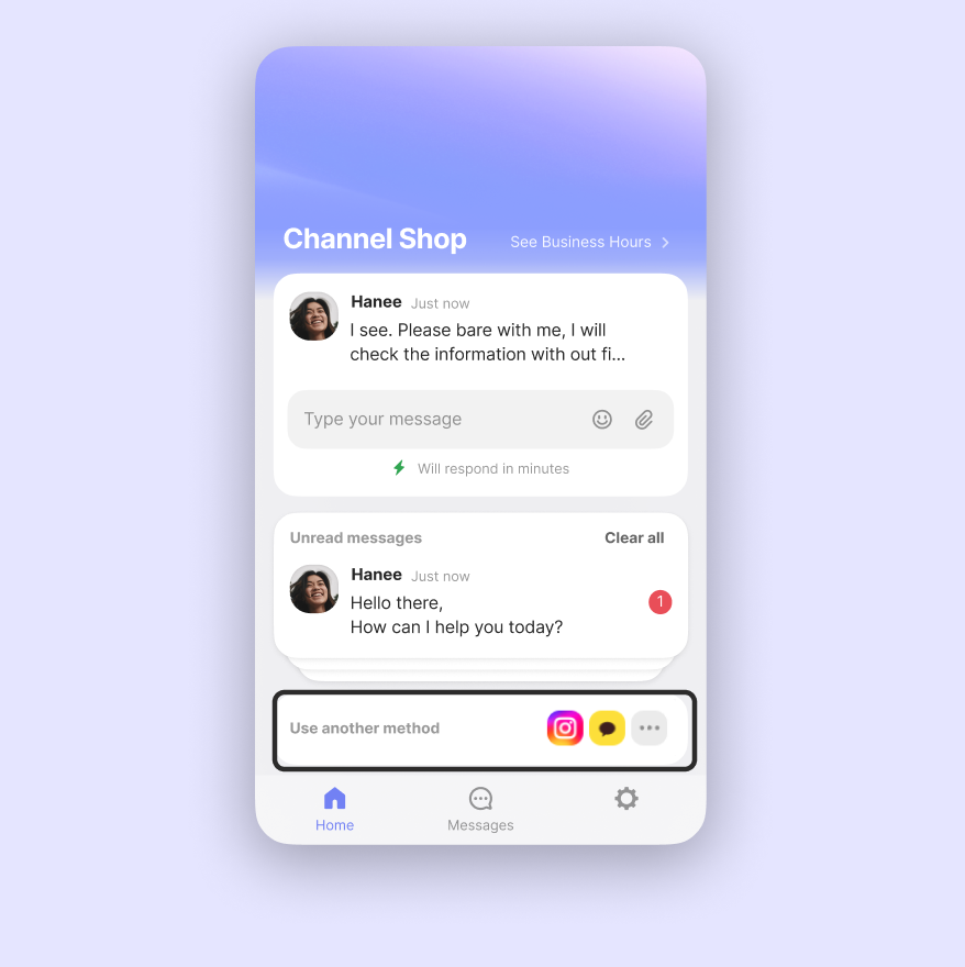 If you have external apps integrated into your channel, you can initiate a chat with each external messenger by tapping the [Use Another Method].