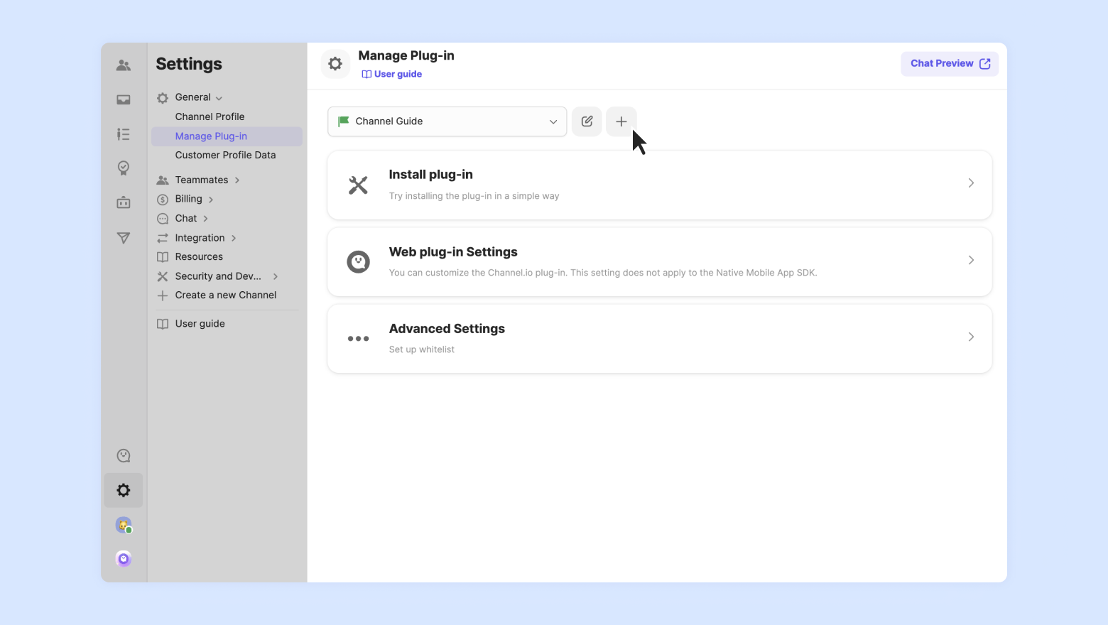 You can set your default plugin used by your channel through the [Set as default plugin] This is the default plugin for the workflow and my Channel Talk plugin link.