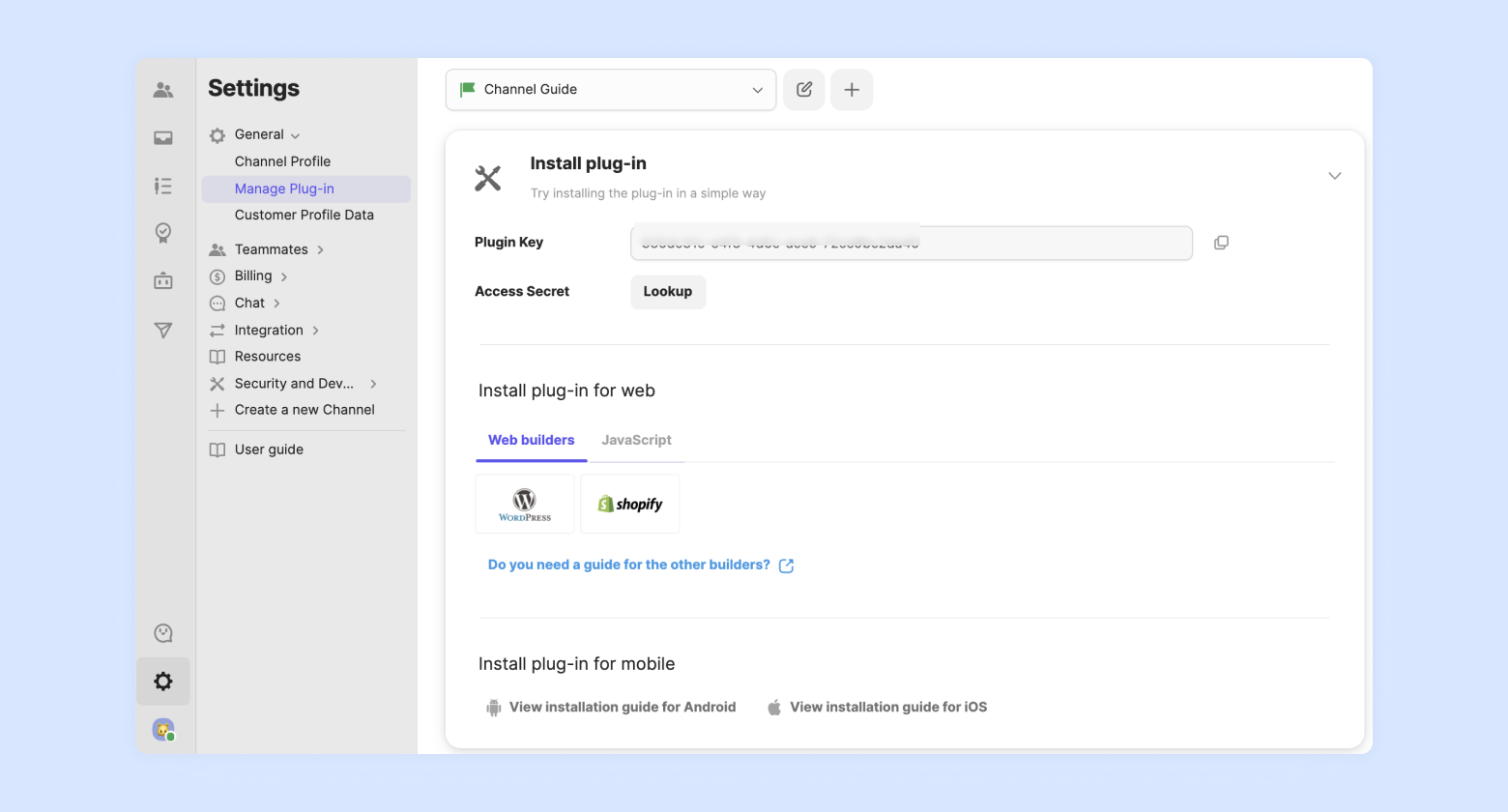 Under these settings, you can retrieve the plug-in key and script.