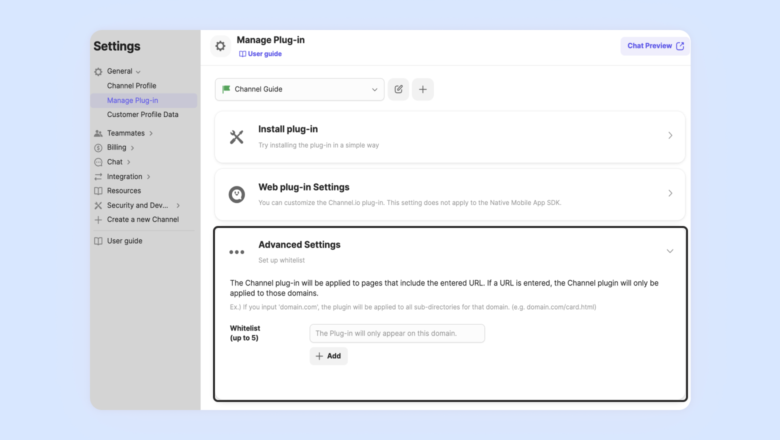 If you want your channel plug-in to only appear on certain pages, you can set up a whitelist.