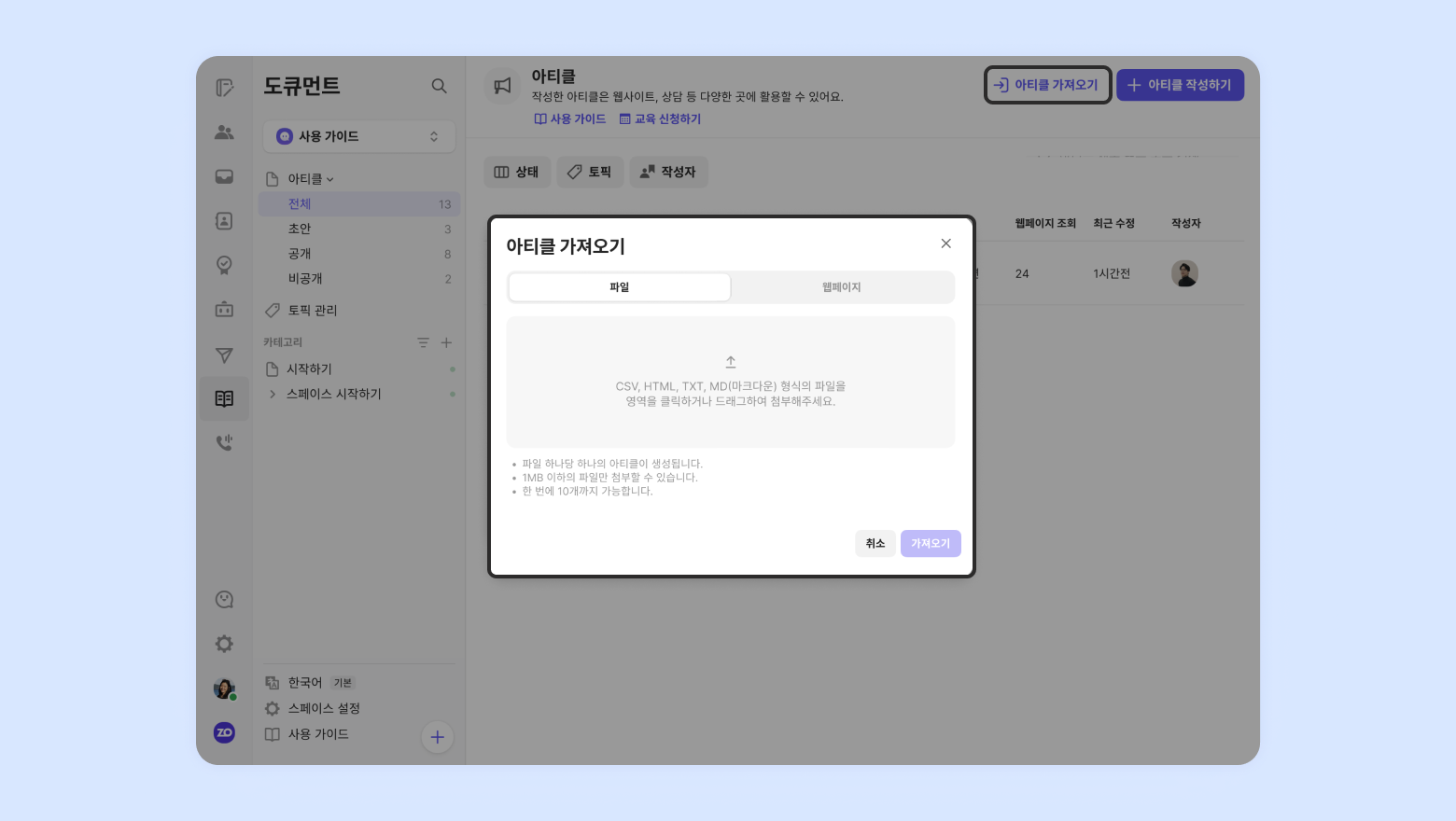 Channel.ioallows importing pages likeChannel.io/document,Channel.io/alf, etc., up to 1,000 pages.