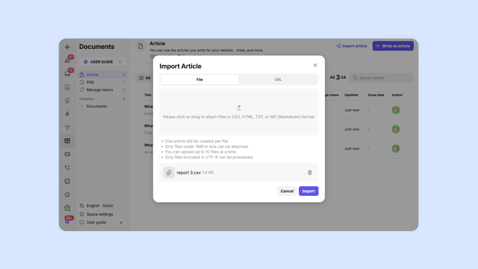 You can upload a file from an external service or enter a URL to quickly create a document article.