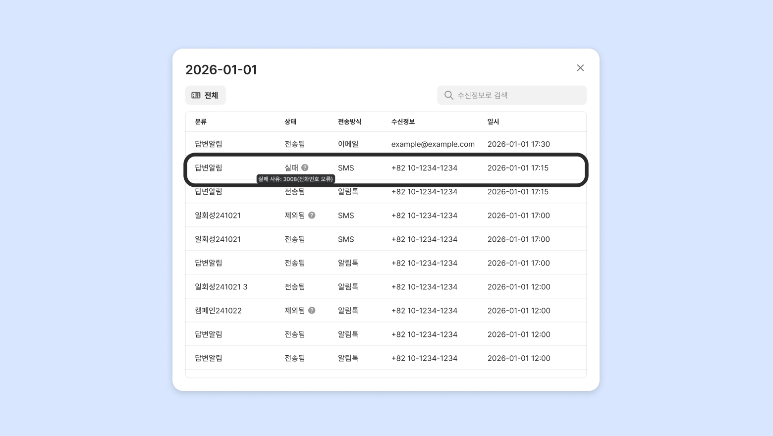You can check the delivery status of each individual SMS and Alimtalk message.