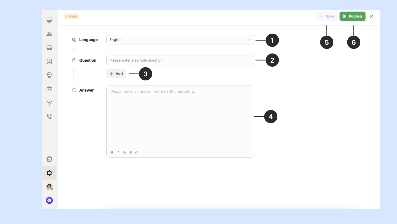 [Channel settings] - [Chat] - [FAQ] - [+ Create new FAQ]