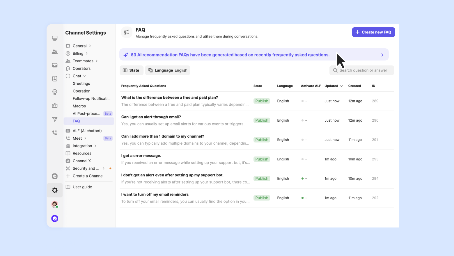 This feature enables you to pre-register commonly asked questions within Channel Talk. Our AI agent, ALF, can then respond to these inquiries by drawing upon the answers provided in the FAQ. (→ ALF Guide)